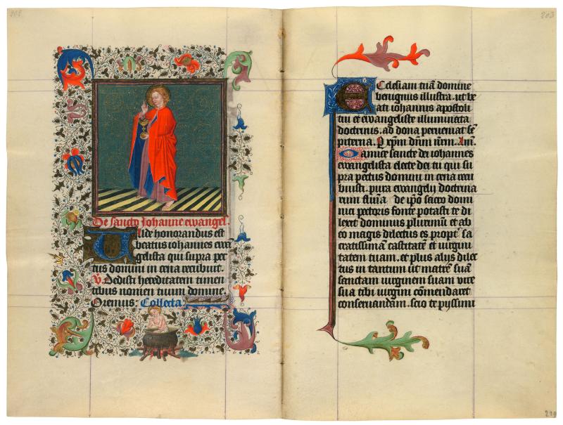 John was an extraordinarily resilient saint. According to tradition, he is the only one of Christ's apostles to live a full life and die of old age. As we see here, however, it was not for lack of trying on the part of his persecutors. In the large miniature, the youthful John, standing on a black-and-white striped floor in front of a richly decorated green and gold background, holds a golden chalice that he blesses with his right hand. A tiny black dragon crawls up from the dregs, thus ridding the cup of the poison that constituted this particular attempt on his life. Below, with hands clasped, John prays inside a cauldron of boiling oil into which he has been thrown by the Emperor Dometian, an attack that he also survived.