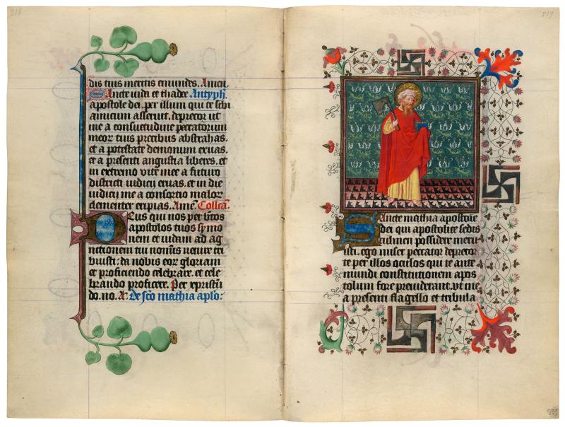 Matthias was chosen by the other apostles to fill the spot left vacant by Judas Iscariot, following his betrayal and subsequent suicide. The apostle stands on scalloped tiles in front of a green backdrop rich with floral decoration. The white turban may reflect his role as a preacher of the Gospel in Ethiopia. The axe is the instrument of his martyrdom: after surviving a stoning in Jerusalem, he was beheaded with an axe. The weapon is seen again in the borders, where three swastikas are comprised of four axes each.