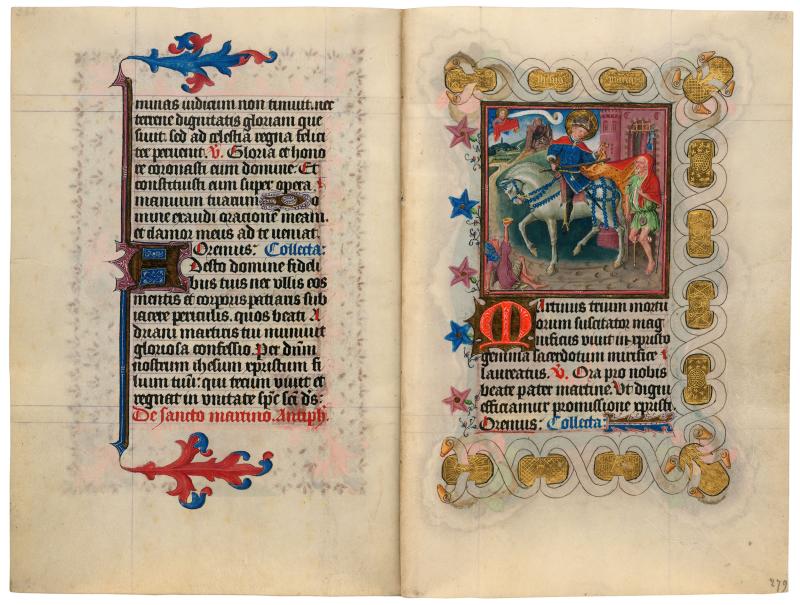 Martin shares his cloak with a beggar. Appearing in the sky is Christ, who, holding the cloth, reveals the true recipient of Martin's charity. A necklace of gold bars, two of which are inscribed with the names of Jesus and Mary, is in the borders.