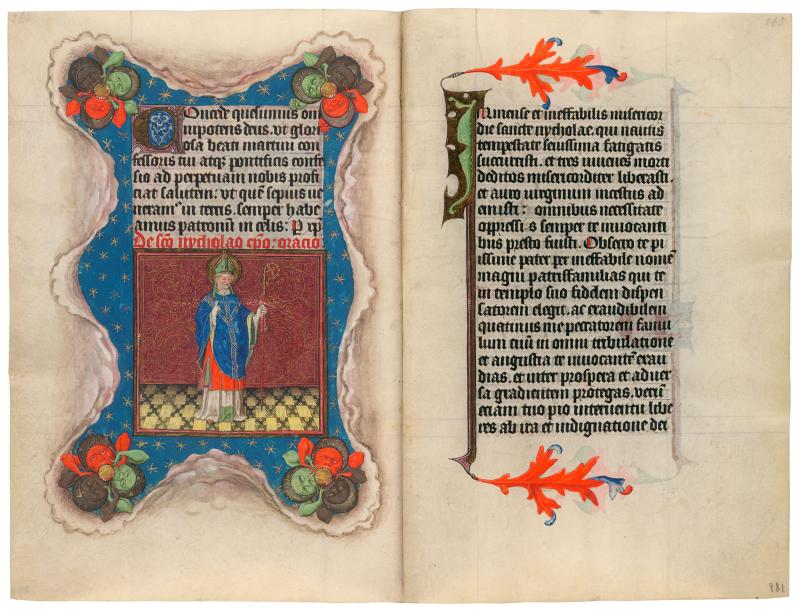 In rich episcopal garb, but without any of his usual attributes, Nicholas stands in the tiled and textiled background seen so often in these pages. He carries a crozier in his gloved left hand and gives a blessing with his right. "Three" is an important number in many of the legends from Nicholas' life and posthumous miracles. The three small monsters at each corner of the border may refer to a number of different tales. They gnaw on small golder orbs, which may allude to the story of Nicholas' generosity to a man inclined to prostitute his three daughters, as he could not supply them with a dowry. Nicholas provided, anonymously and on three separate occasions, a bag full of gold to ensure that this terrible fate would not befall them. Another possible explanation is that the orbs and silver crescent hats of the monsters represent the sun and moon, attributes of the saint's role as spreader of light to the world. The trompe-l'oeil effect of peeling back cloud-like strips of vellum to reveal a starry sky could be a navigational allusion and representation of the calm skies sought by sailors, of whom Nicholas was patron.