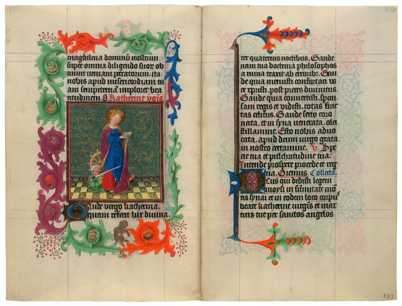 Catherine, nobly dressed in a crown and a luxurious ermine-lined cloak, prays from a small book bound in green cloth. Her attributes, the spiked wheel and sword, sit behind and beneath her. The sword is held by the Syrian Emperor Maximinus who lies vanquished beneath her feet. Maximinus had ordered the torture and execution of the young virgin saint after she refused his hand in marriage. The bear cub (catulus in latin) who toys with a red, gold, and green ball in the border may be a pun on Catherine's name.