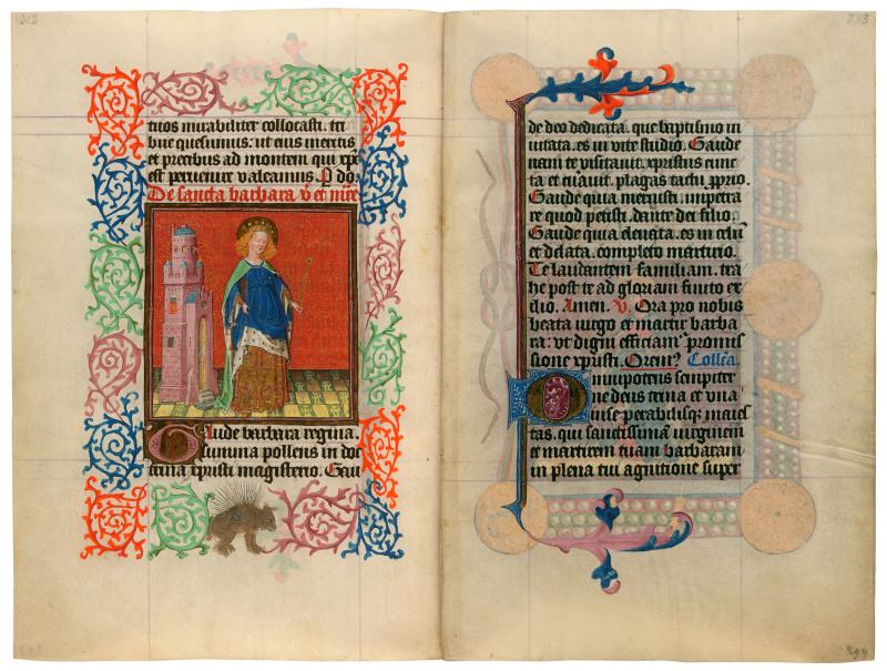 Barbara stands beside her attribute, the tower in which her cruel father, Dioscorus, shut her to prevent the attentions of suitors. In her captivity Barbara secretly converted to Christianity and built three windows, representing the Trinity, into the tower walls. Her disgruntled father ensured her martyrdom by personally beheading her. Here, Barbara is crowned with flower buds and clothed regally in a gold brocade garment beneath an ermine-trimmed blue dress. Because of associations between her birthplace of Heliopolis and the phoenix and between the phoenix and the peacock, one of her attributes is a peacock feather, which is lightly grasped in her left hand. The tower motif is repeated in the floor tiles. In the border hunches a spiny porcupine, which may represent Barbara's patronage of diverse trades involving hairs and bristles.