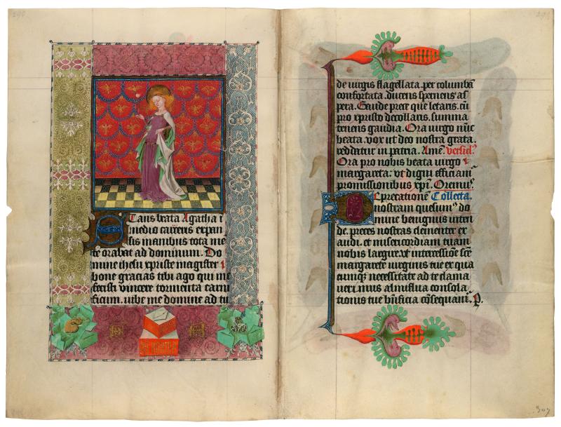 Holding her attribute, a pair of pincers with one of her severed breasts, Agatha stands before a textile embroidered repeatedly in gold with a phoenix rising from flames. The motif is appropriate to Agnes as the patron of forging and casting. The cast jewelry in the bottom border provides further reference to this patronage.