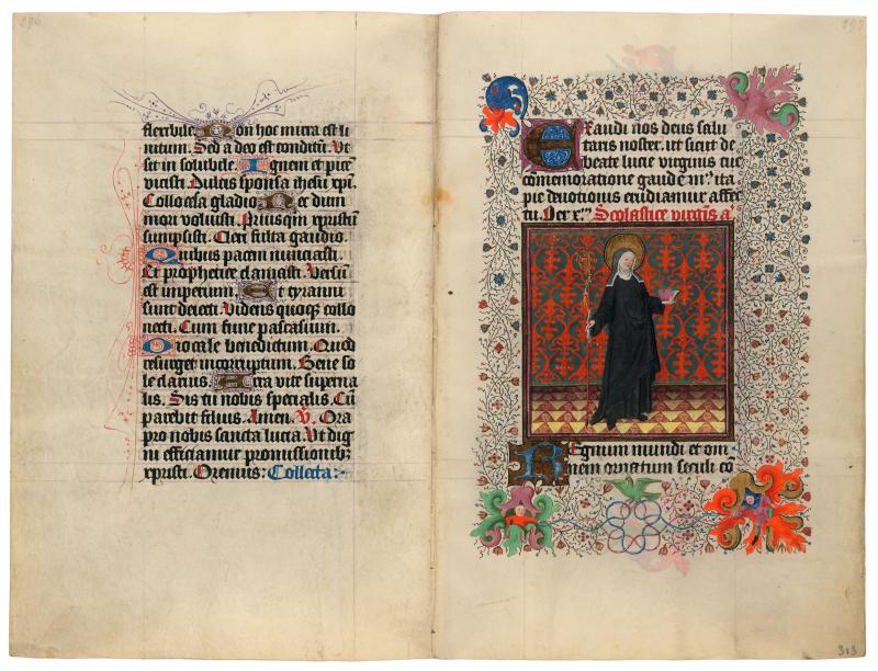 Scholastica, twin sister to St. Benedict, wears the habit of a Benedictine abbess and holds a book and a crozier. Her usual attribute, a dove, the form in which she ascended to heaven, is lacking here, while the border contains an antithetical scene of two boys hoping to snare a bird.