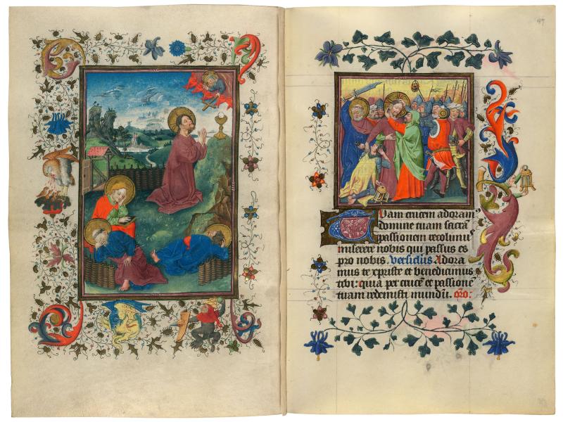 Like the Hours of the Virgin, the Hours of the Passion marked each of its textual divisions with juxtaposed full- and half-page miniatures. Thus Christ's Passion unfolds with a rich suite of sixteen illustrations. The cycle commences with Christ in the garden of Gethsemane. While apostles doze, the Savior beseeches his Father to remove the cup before him. The cup, a chalice containing a communion wafer, symbolizes both his forthcoming death and the Eucharist. The Eucharistic theme is reiterated by the border vignette of the pelican feeding her young with her own blood, a symbol of Christ's sacrificial Death on the Cross. In the next scene, following Judas's kiss, soldiers seize Christ, who calmly replaces the ear that Peter has sliced from Malchus.