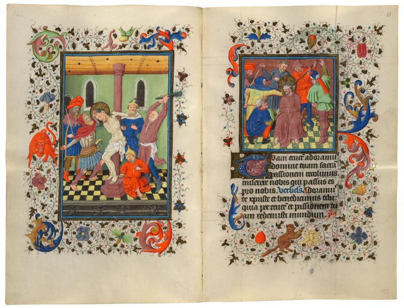 At the left, Pilate, decadently dressed in a tall bag hat worn over a dagged chaperon, directs Christ's torment, the scepter of authority in his right hand. The frail Christ is tied to a column by two men in exotically pointed hats, while two others energetically punch or flagellate the Savior's bleeding body. The unusual reddish color of the column and its base might refer to Christ's blood. In the smaller miniature, Pilate, again at the left, directs the crowning of Christ with thorns. While others continue to strike the blindfolded Savior, two men apply the tortuous crown with long staves.
