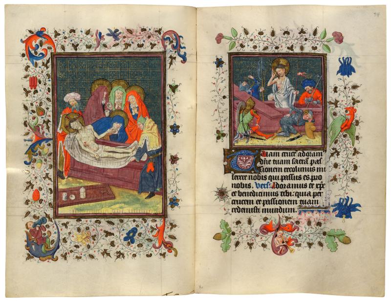 The Hours of the Passion conclude with the Resurrection, a subject rarely included in such cycles since the event is not part of Christ's Passion. Typical of