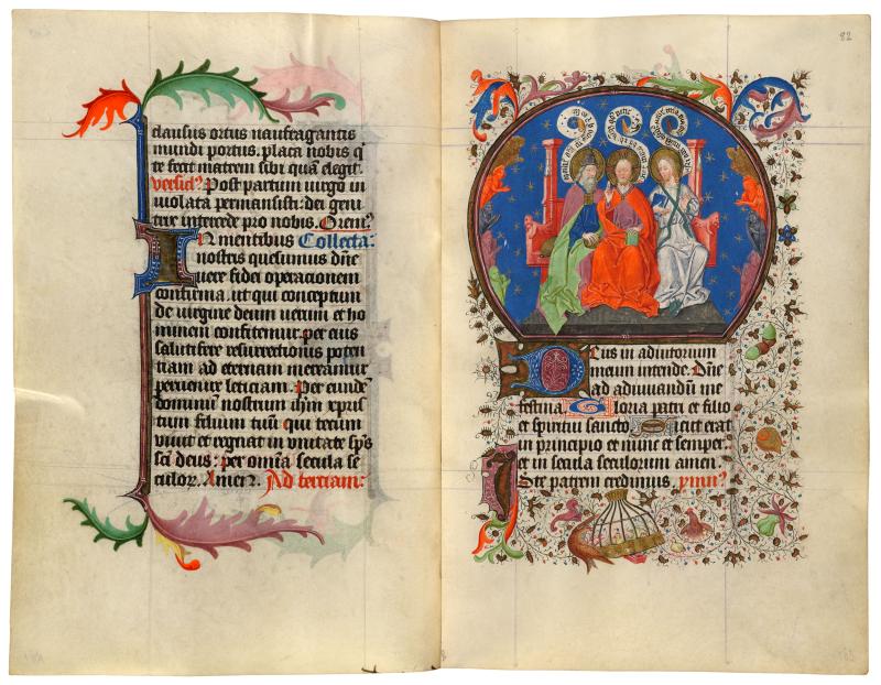 The Three Persons of the Trinity sit on a throne floating in a starry sky surrounded by representatives of the nine choirs of angels. Scrolls give words to their debate. God the Father argues that "Adam will die with all those who are from my tribe." The Holy Spirit advocates compassion: "If Adam does not achieve mercy, then your mercy, Lord, will perish." Accepting his sacrificial role, Christ has the last words: "May it be a good death, and may he obtain what he requests."