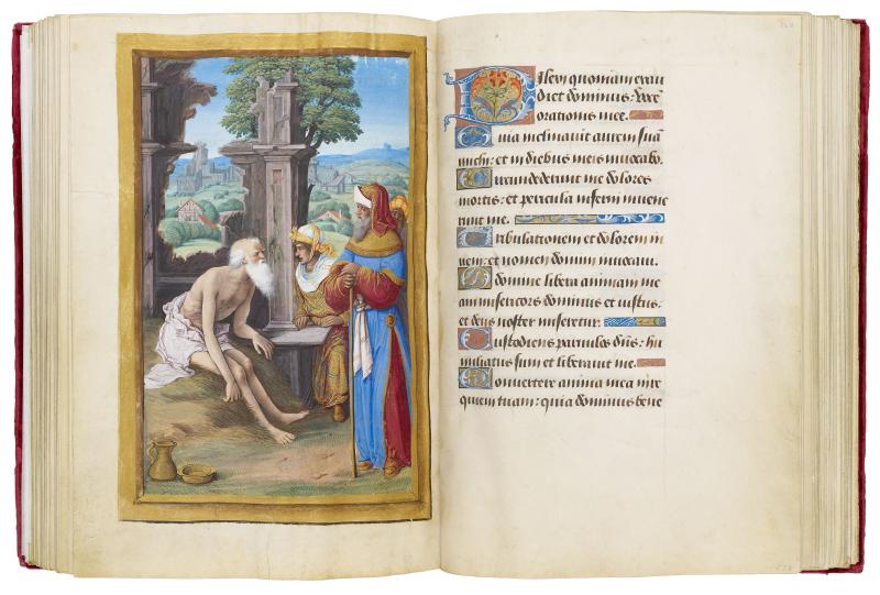 Although the Office of the Dead almost always contains a single miniature, the present manuscript has two. The second miniature, as here, usually marks the beginning of Matins, a division reflecting the practice of recitation observed above. Other examples are known, such as the Hours of Etienne Chevalier in Chantilly (Musée Condé, MS 71), which was painted by Jean Fouquet in the 1450s, and which Poyer had probably seen. Among the most common illustrations for the Office are various moments of the funeral (from deathbed to burial), the Last Judgment, Raising of Lazarus, Hell, personifications of Death, Job on the Dungheap, and the Parable of Dives and Lazarus. The last two subjects were selected for the Hours of Henry VIII. Although the nine Matins lessons are taken from the Book of Job, they do not specifically refer to the theme that frequently serves as a frontispiece for the Office, Job's discourse with his three friends, Eliphaz, Bildad, and Zophar.