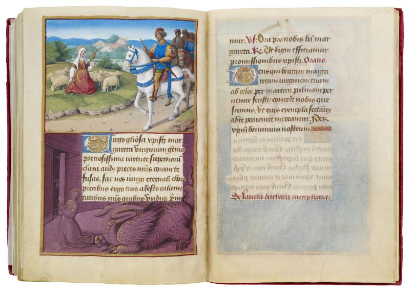 One day Governor Olybrius of Antioch, as in the miniature, saw Margaret spinning wool while tending sheep and fell in love with her. Margaret's refusal to yield her faith angered the governor.