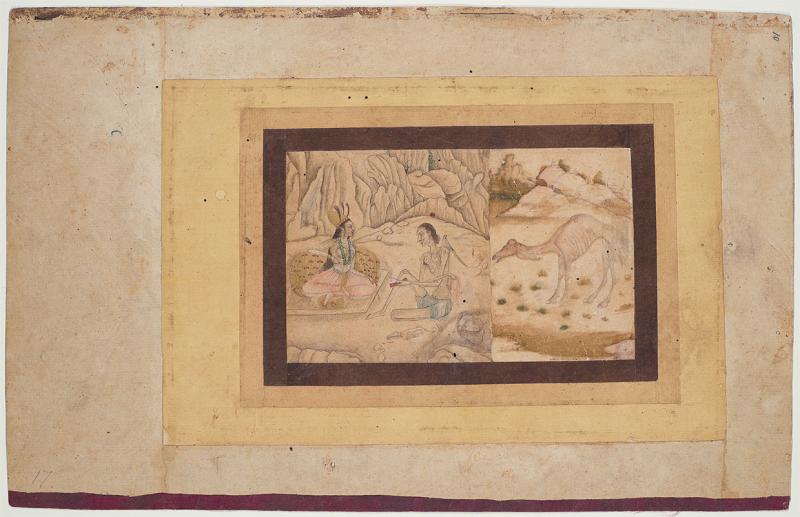 An emaciated camel and an ascetic and a princess seated together in the mountains