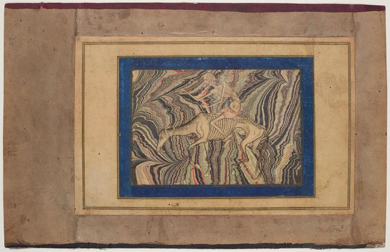 Emaciated horse and rider, with marbled background