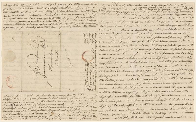 Those that remain are marked by thrift. Because paper was expensive, Austen kept most of her missives to a single sheet, folded in half to make four pages. Postage at the time was charged by the number of sheets and distance travelled and paid by the recipient. To save space, Austen wrote to the very edge of the page, sometimes even upside down between the lines or perpendicularly across them, a common practice known as cross writing that would have tested Cassandra’s eyes and patience. Postscripts appear squeezed at the top of the sheet or sideways on the last page, which, before the widespread use of envelopes, doubled as an address panel.
