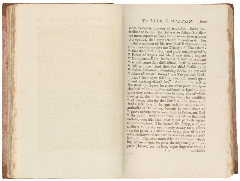 101. PML 966, Vol. 1, part 1, Leaf bound in following Life of Milton, p. 74, verso–The life of Milton, p. lxxv