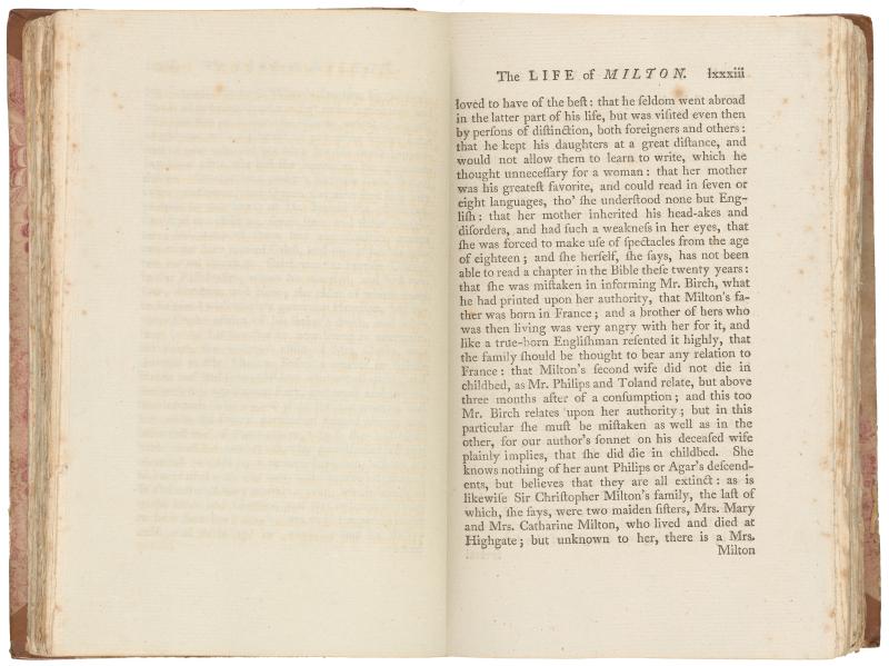 109. PML 966, Vol. 1, part 1, Leaf bound in following Life of Milton, p. 82, verso–The life of Milton, p. lxxxiii