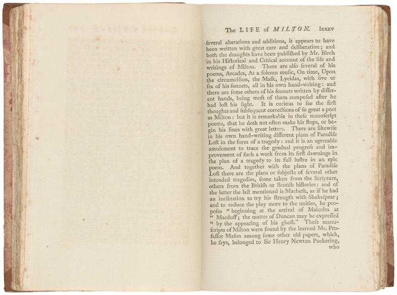 111. PML 966, Vol. 1, part 1, Leaf bound in following Life of Milton, p. 84, verso–The life of Milton, p. lxxxv