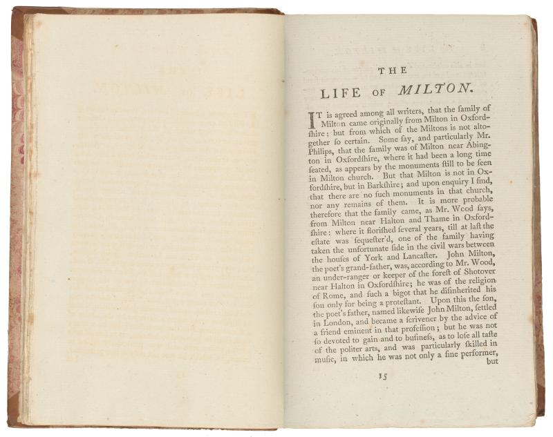 027. PML 966, Vol. 1, part 1, Leaf bound in following Preface, p. [1], verso–The life of Milton, p. [i]