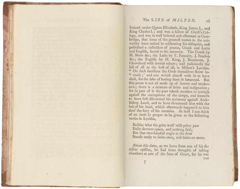 033. PML 966, Vol. 1, part 1, Leaf bound in following Life of Milton, p. 6, verso–The life of Milton, p. vii