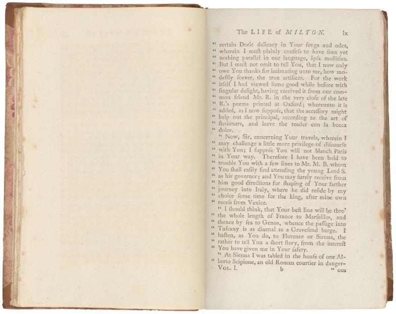 035. PML 966, Vol. 1, part 1, Leaf bound in following Life of Milton, p. 8, verso–The life of Milton, p. ix