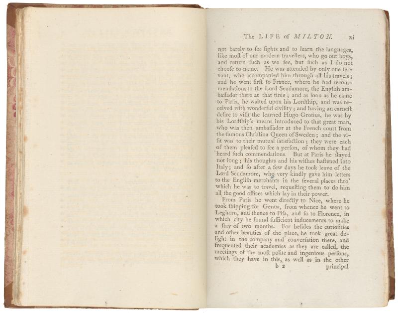 037. PML 966, Vol. 1, part 1, Leaf bound in following Life of Milton, p. 10, verso–The life of Milton, p. xi