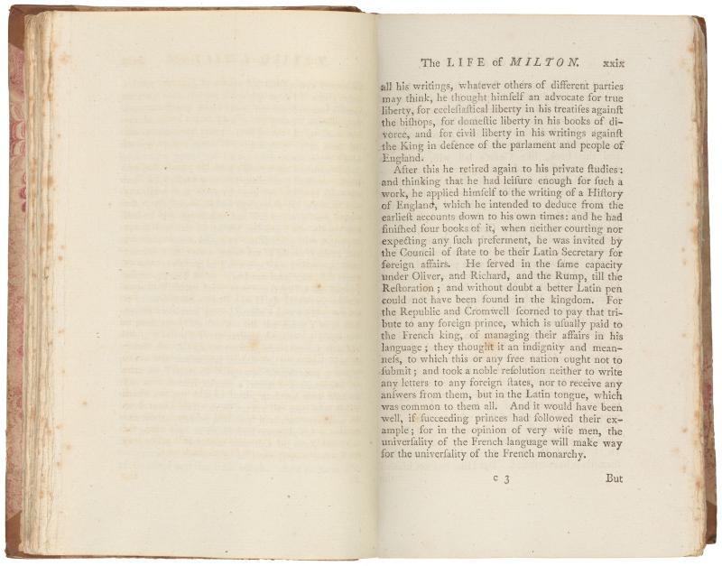 055. PML 966, Vol. 1, part 1, Leaf bound in following Life of Milton, p. 28, verso–The life of Milton, p. xxix