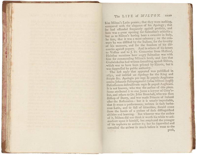 061. PML 966, Vol. 1, part 1, Leaf bound in following Life of Milton, p. 34, verso–The life of Milton, p. xxxv