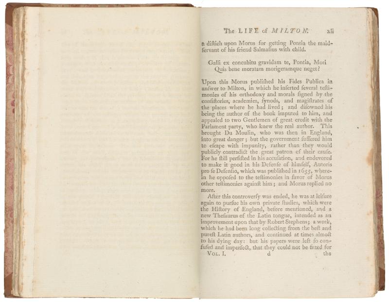 067. PML 966, Vol. 1, part 1, Leaf bound in following Life of Milton, p. 40, verso–The life of Milton, p. xli