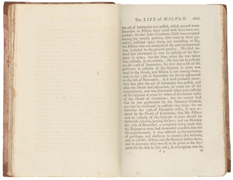 073. PML 966, Vol. 1, part 1, Leaf bound in following Life of Milton, p. 46, verso– The life of Milton, p. xlvii