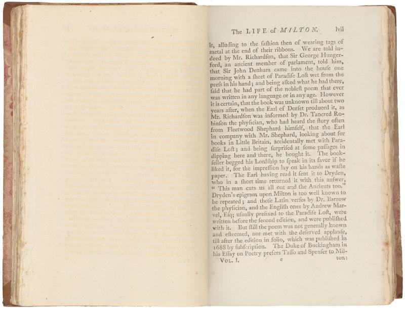 083. PML 966, Vol. 1, part 1, Leaf bound in following Life of Milton, p. 56, verso–The life of Milton, p. lvii