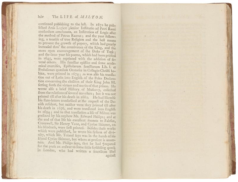 090. PML 966, Vol. 1, part 1, The life of Milton, p. lxiv–Leaf bound in following Life of Milton, p. 64, recto