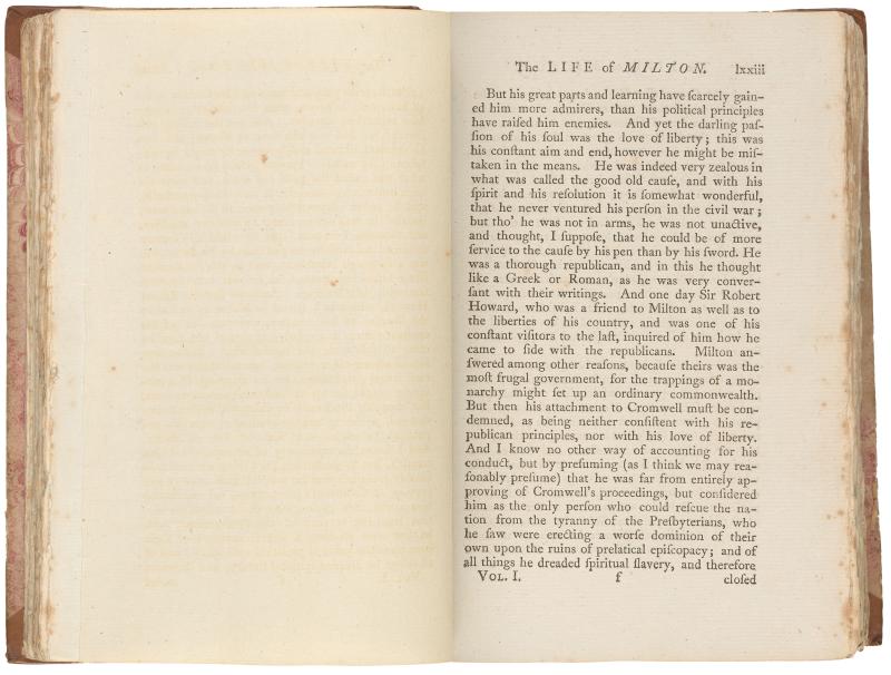 099. PML 966, Vol. 1, part 1, Leaf bound in following Life of Milton, p. 72, verso–The life of Milton, p. lxxiii