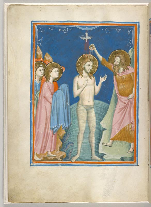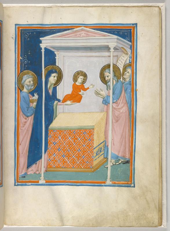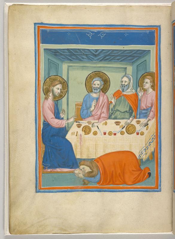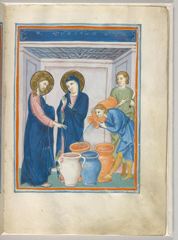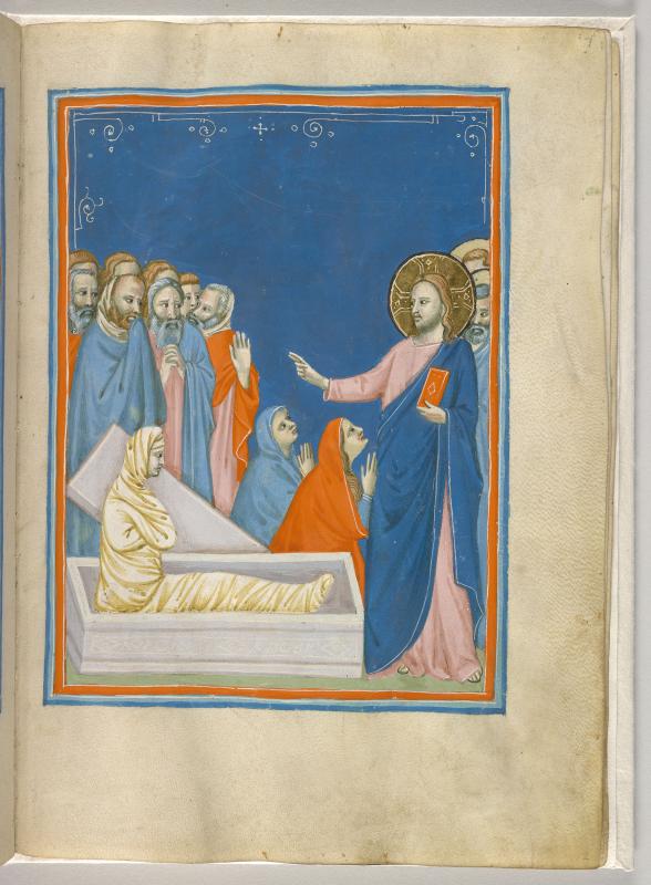 This unusual picture book contains thirty-eight full-page illuminations by the Florentine illuminator Pacino di Bonaguida (ca. 1280-1340) and his workshop. The pictures include two from the Old Testament, thirty-two from the life of Christ, and four from the life of Blessed Gerard of Villamagna. The images contain some unusual iconography. On folio 12, for example, Christ climbs a ladder to his cross—indicative of his willingness to sacrifice his life for humankind. Folio 19v shows the funeral of Blessed Gerard: guards were needed to keep order, so many were those who came to see his body, and his coffin had to be positioned in a tree!