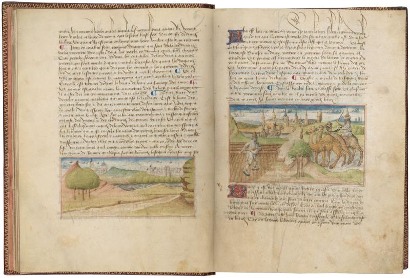 In the Middle Ages, as today, Bactria was famous for its camels, here driven by a turban-wearing man; they are, though, located in what looks to be a typical European town.