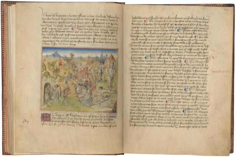 Among the more splendid illuminations in the manuscript, the image of Ethiopia presents a cornucopia of monstrous wonders, humanoid and bestial, such as the headless blemmyes, cave-dwelling lizard-eaters, a large-eared giant, and a huge bird of prey with horns.