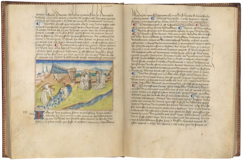 Jerusalem is represented here as a Christian territory, with no trace of Jewish or Muslim presence. The miniature features the river Jordan, a group of pious hermits, and the pool of Bethesda stirred by an angel from heaven.