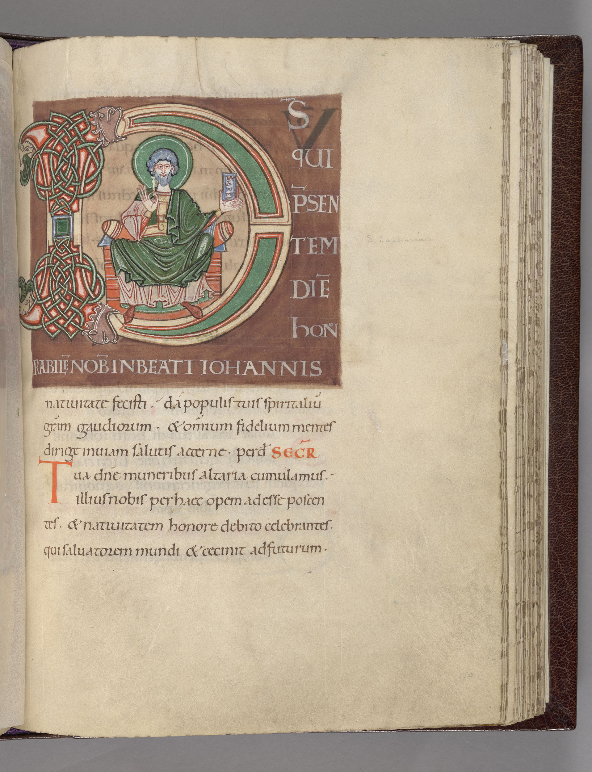 Figure within initial D decorated with interlace and animal heads, at beginning of Collect for Feast of Birth of John Baptist.