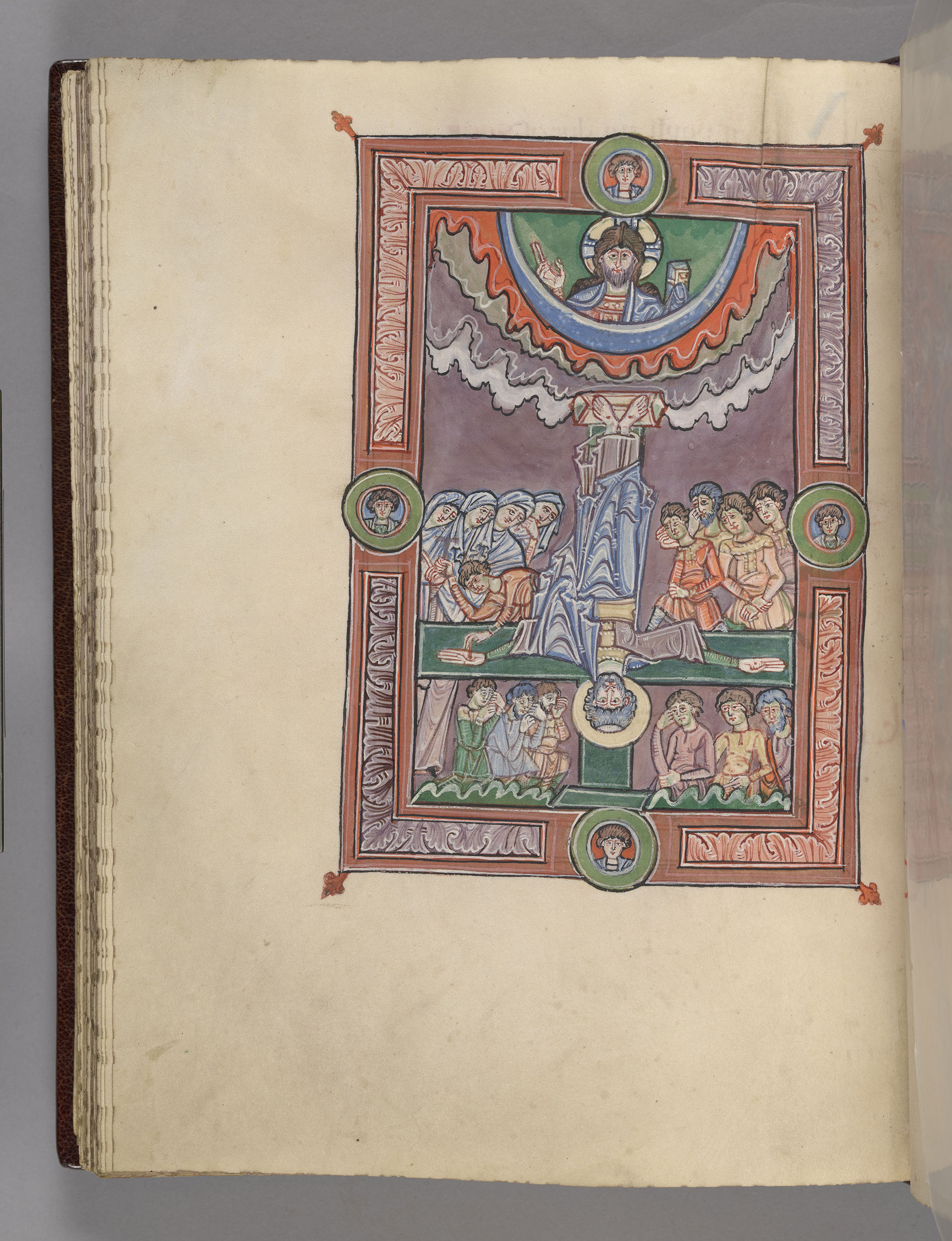 Scene within frame decorated with foliate ornament and with four medallions enclosing busts of male figures.