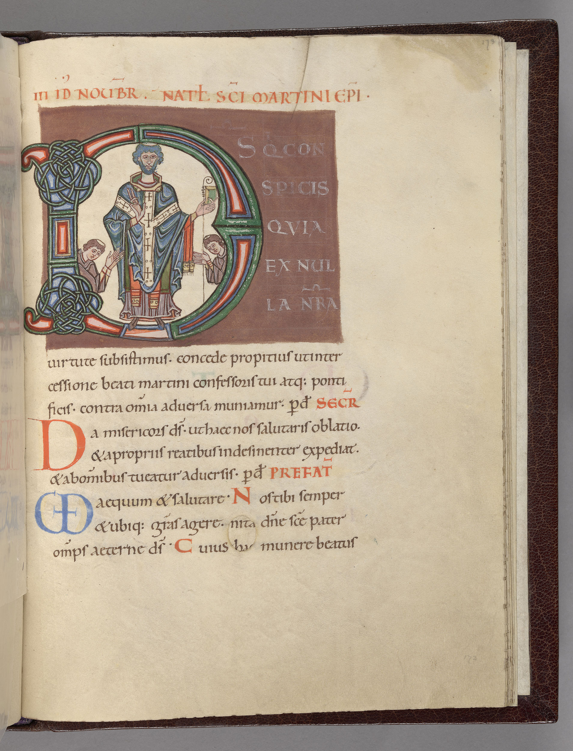Figures within initial D decorated with interlace, at beginning of Collect for Feast of Martin of Tours.