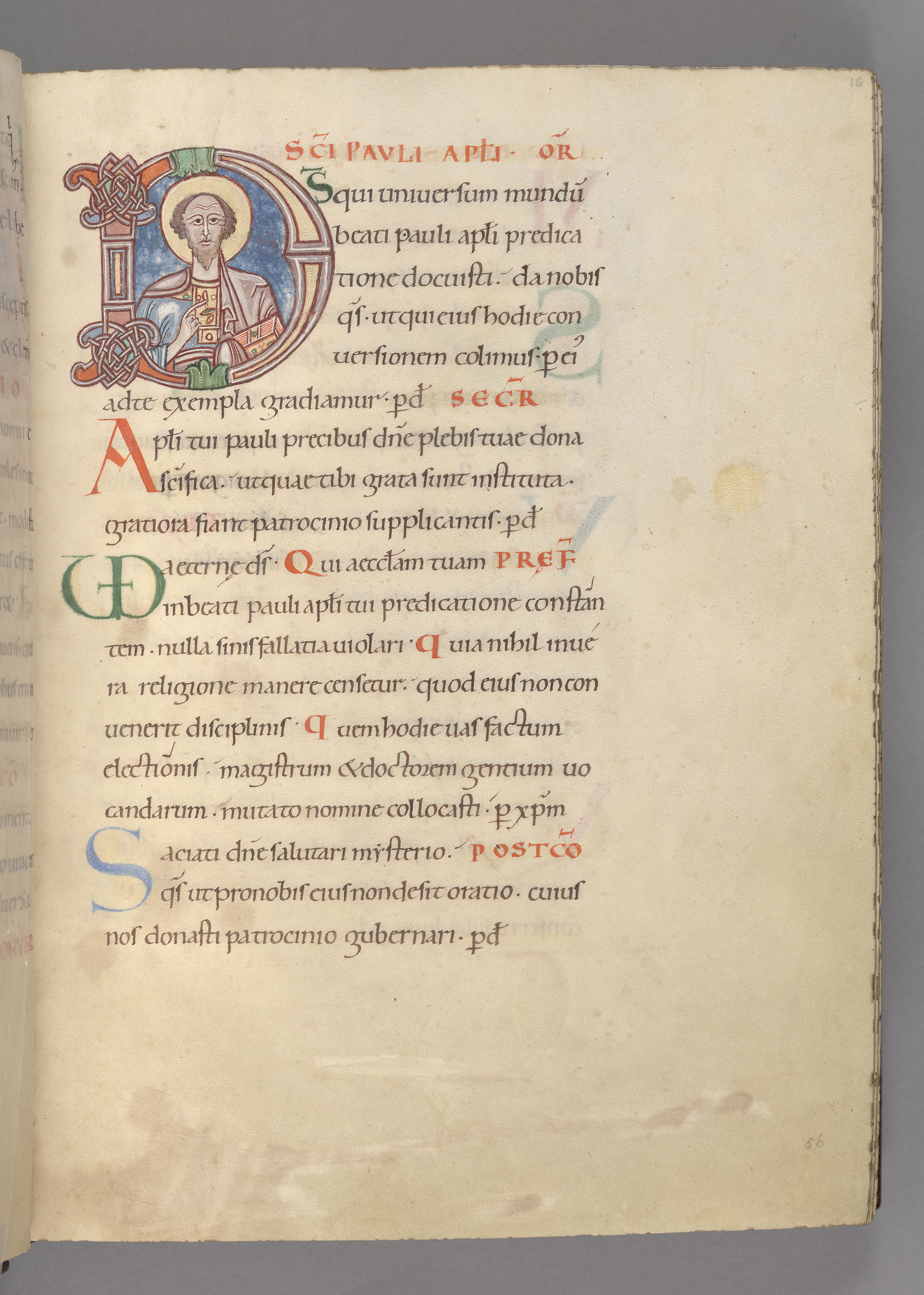 Half figure within initial D decorated with interlace, at beginning of Collect for Feast of Conversion of Apostle Paul.