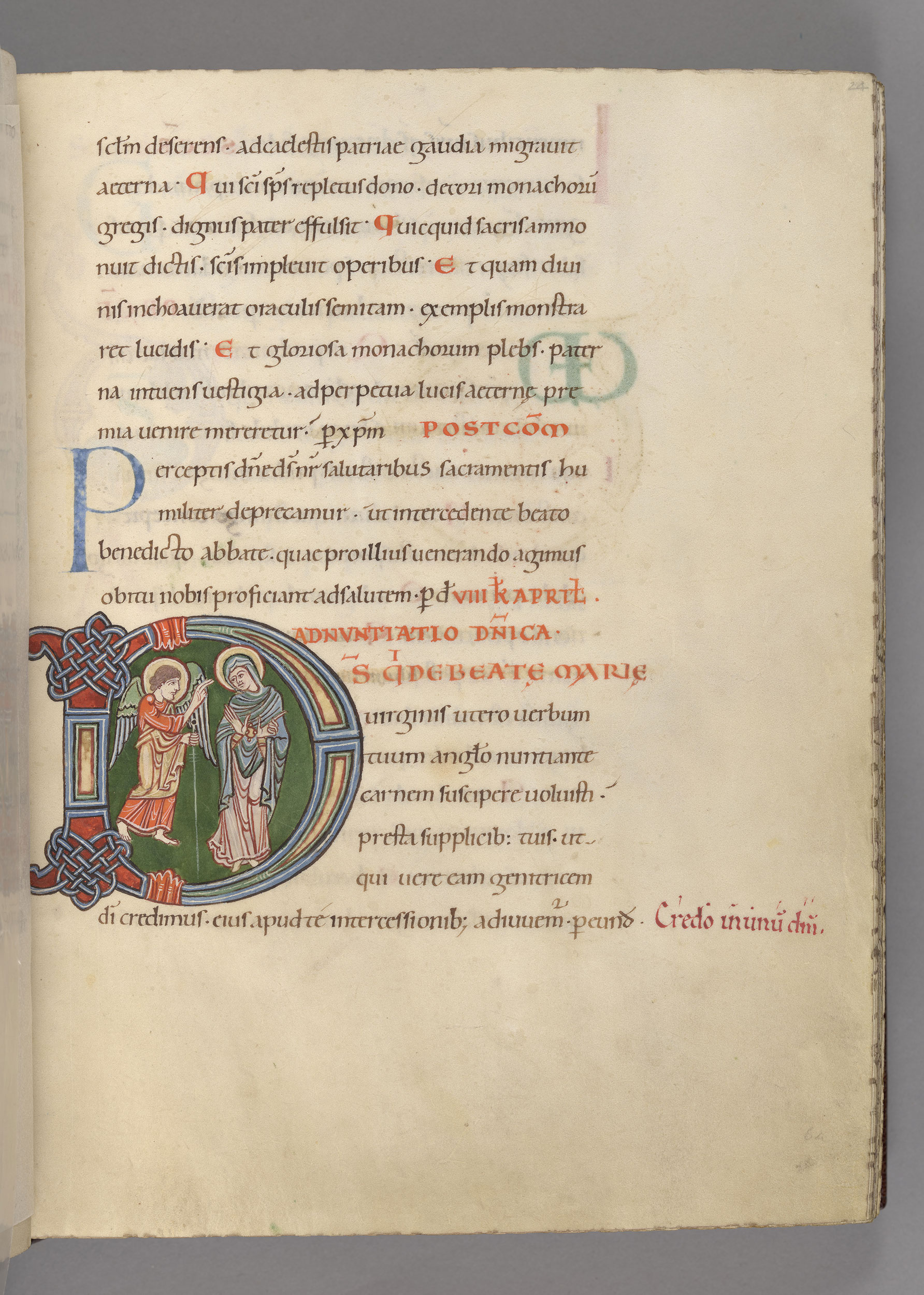 Scene within initial D decorated with interlace, at beginning of Collect for Feast of Annunciation.
