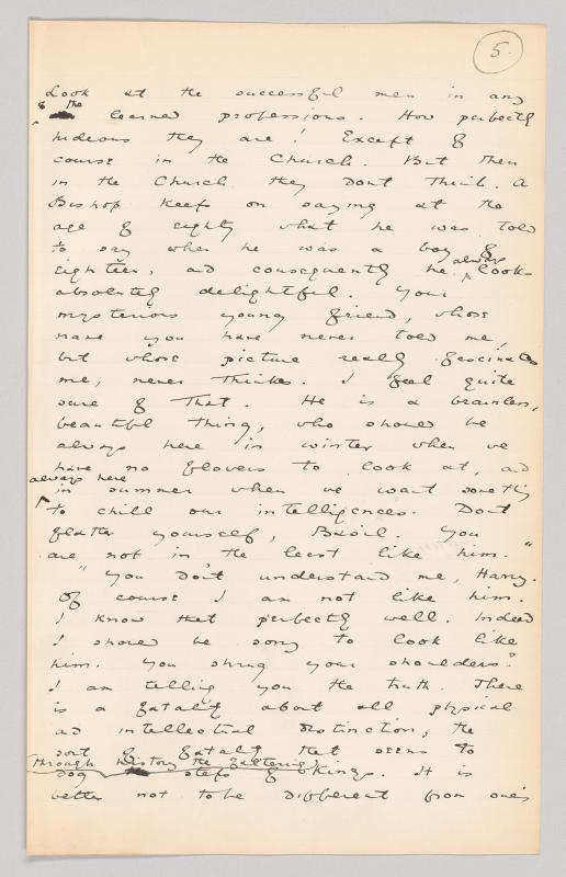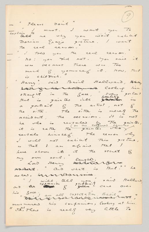 It is well known that Wilde made several revisions to the 1891 edition of Dorian Gray that downplay the homoerotic exchanges of Basil Hallward, Lord Henry Wotton, and Dorian Gray. In some cases Wilde introduced such changes in the manuscript itself, as on pg. 9, where he removes a reference to Hallward clasping Wotton’s hand: “‘Harry,’ said Basil Hallward, taking hold of his hand, and looking him straight in the face.” Likewise on pg. 20, Wilde cut an additional two sentences that expanded Hallward’s description of Dorian Gray sitting for his portrait: “ … while I was painting it, Dorian Gray sat beside me.’ And, as he leaned across to look at it, his [illegible] hairjust brushed my cheek touched my hand.’ The world becomes young to me when I hold his hand, as when I see him, the centuries yield all up their secrets!’”