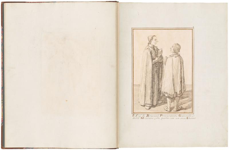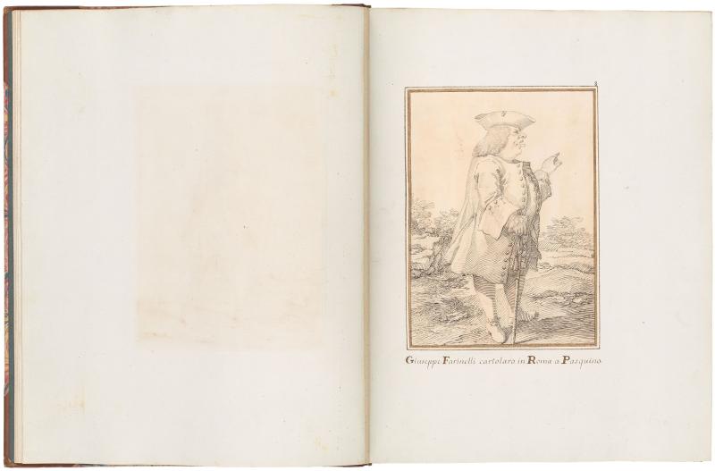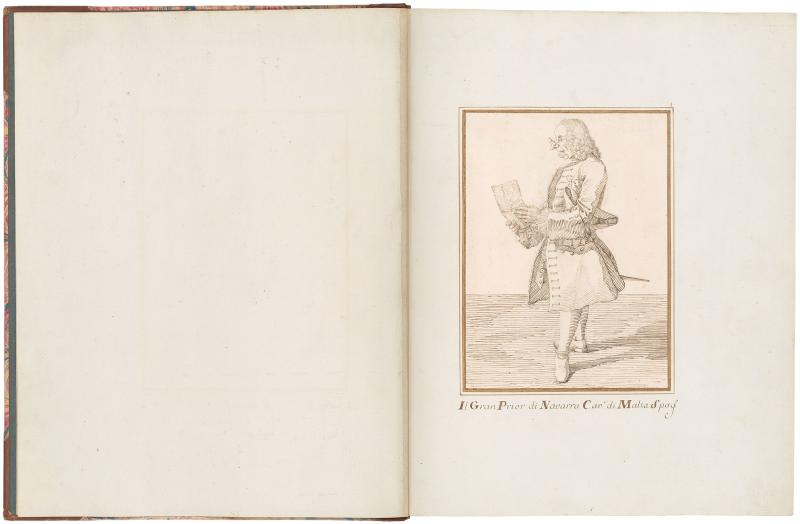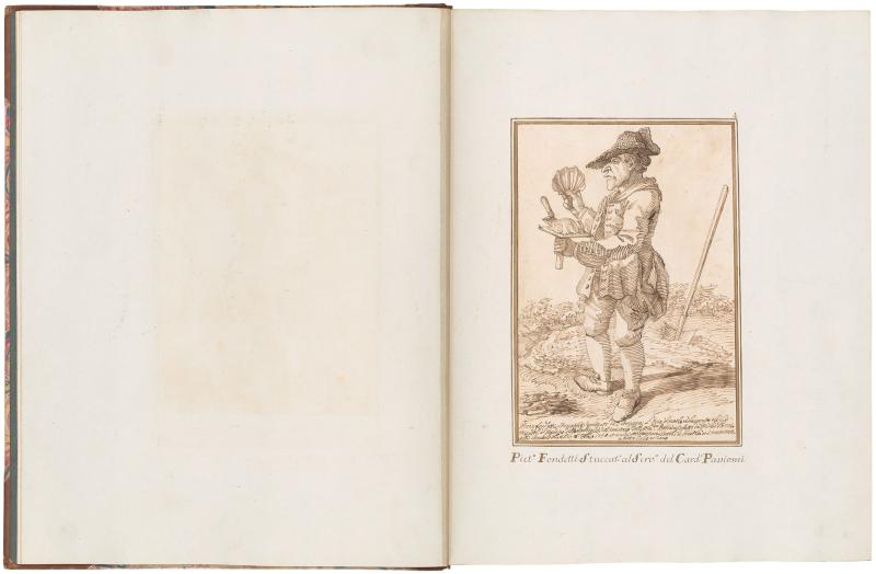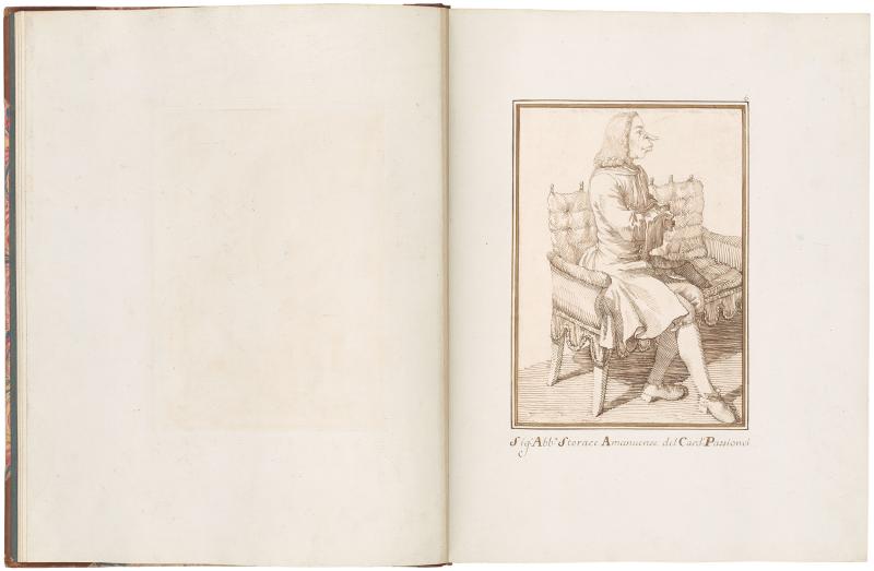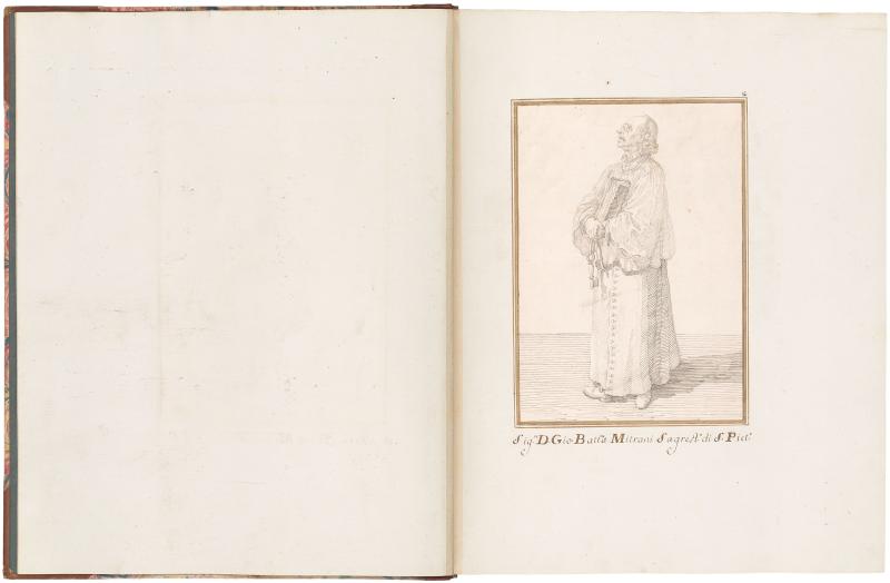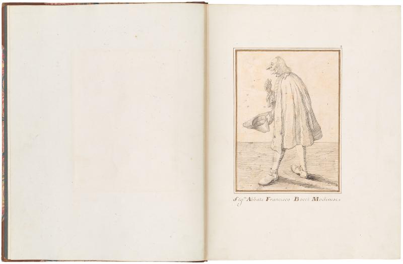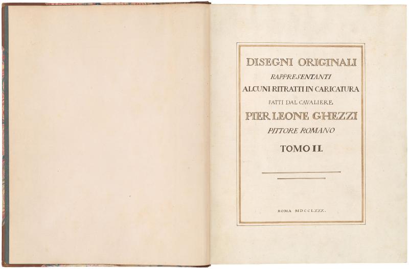 The present album of Ghezzi drawings is from a group of three that appeared on the art market in the early 1970s. Volumes 1.1 and 1.2 were disbound and the sheets scattered (some individual sheets as well as the binding of volume 1.1 are in the Metropolitan Museum of Art). This third volume, however, was preserved intact and includes more than 100 caricatures, forty-eight full-page portraits and sixty-four portrait busts.