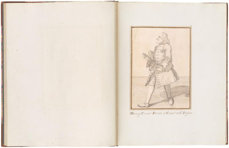The present album of Ghezzi drawings is from a group of three that appeared on the art market in the early 1970s. Volumes 1.1 and 1.2 were disbound and the sheets scattered (some individual sheets as well as the binding of volume 1.1 are in the Metropolitan Museum of Art). This third volume, however, was preserved intact and includes more than 100 caricatures, forty-eight full-page portraits and sixty-four portrait busts.