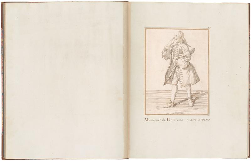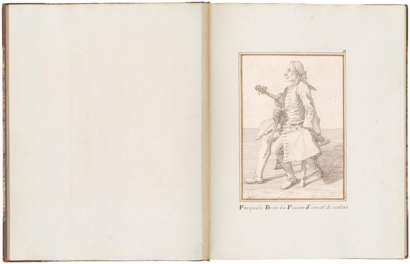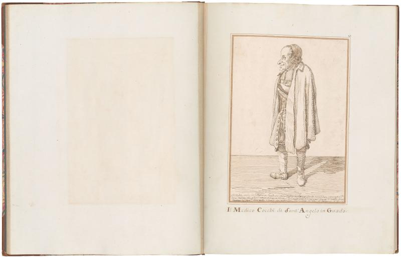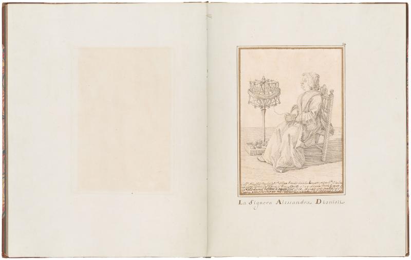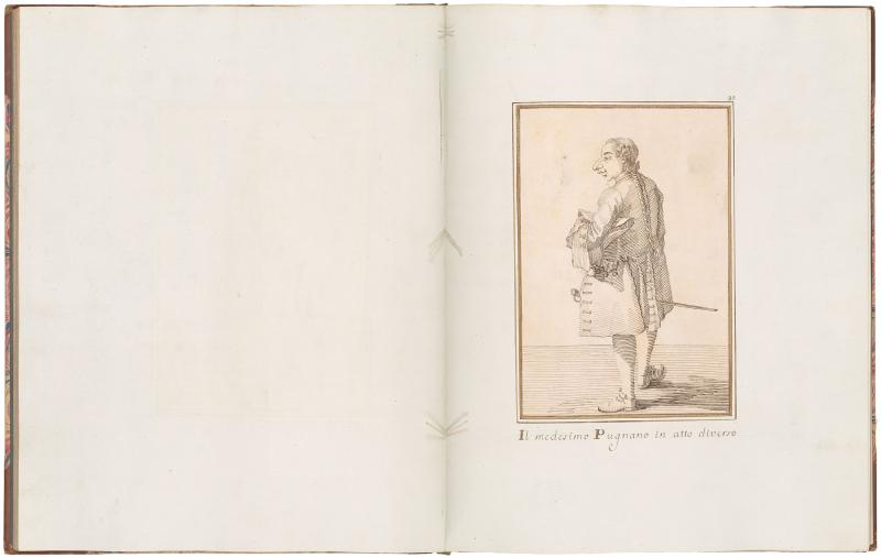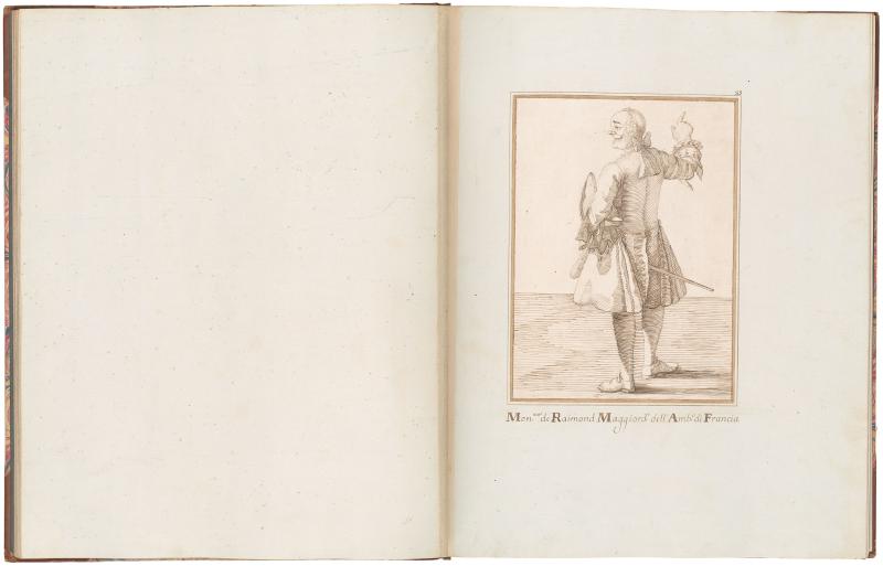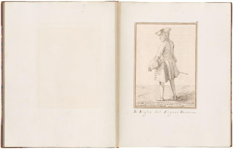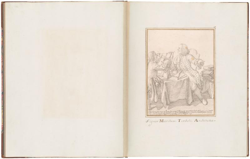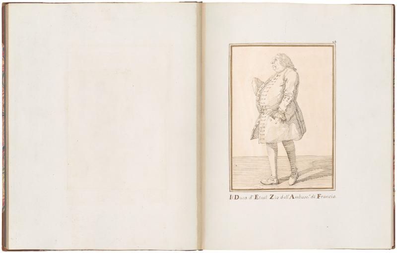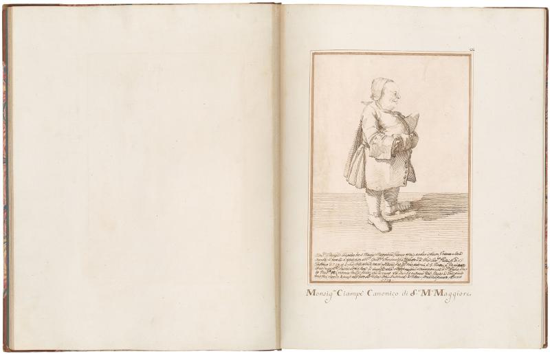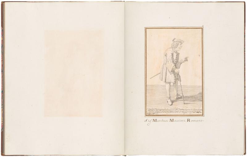 The present album of Ghezzi drawings is from a group of three that appeared on the art market in the early 1970s. Volumes 1.1 and 1.2 were disbound and the sheets scattered (some individual sheets as well as the binding of volume 1.1 are in the Metropolitan Museum of Art). This third volume, however, was preserved intact and includes more than 100 caricatures, forty-eight full-page portraits and sixty-four portrait busts.