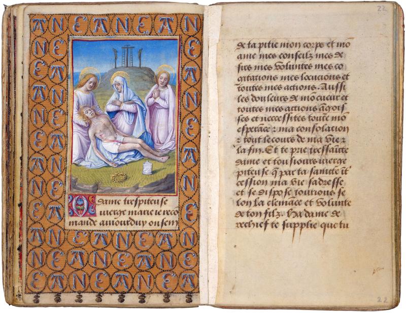 The prayer accompanying this miniature is this book's only text in the vernacular, French, and was composed particularly for Anne de Bretagne. In the prayer Anne addresses the Virgin in a personal way, seeking protection from those who might harm her and from those who might usurp her possessions.