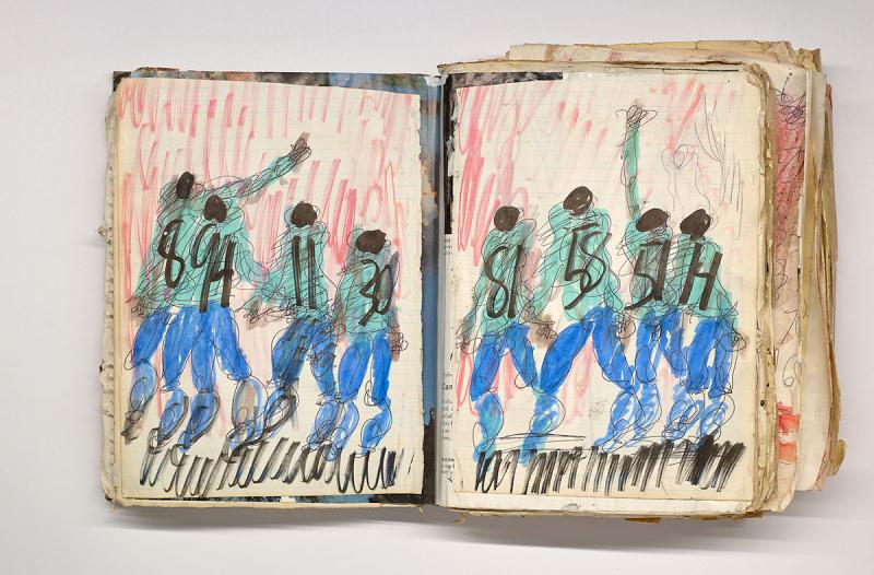 Purvis Young (1943–2010) was part of a younger generation of Black artists in the South. Inspired by the cultural activism of the 1960s and the art of Rembrandt and El Greco, he created a monumental work of street art in Overtown, Miami, by affixing hundreds of painted panels to the wall of an abandoned alley. The alley was called Goodbread, in reference to a bakery that had once been there. It was a casualty of so-called urban renewal, the practice of decimating Black and Hispanic neighborhoods under cover of eminent-domain laws in order to make way for highways, stadiums, and the like. In addition to his paintings and drawings on panel, Young created books, like this one, which the Morgan acquired from the Souls Grown Deep Foundation. It is a found book that he covered over and filled with his own drawings—an act of reclamation. Called Sometimes I Get Emotion from the Game (early 1980s), the book is an ode to the basketball and football players of Overtown. Over more than a hundred spreads, Young’s players, some rendered in ballpoint pen, others in marker, some dressed in numbered jerseys, some bare chested, transform the found sheets on which they are drawn into ecstatic illuminations. As the book's title and imagery suggest, Young viewed sports as a space of freedom and release from the oppressive conditions that governed the lives of young Black men. "My feeling was the world might get better if I put up my protests. Even if it didn't, it was just something I had to be doing," he said.