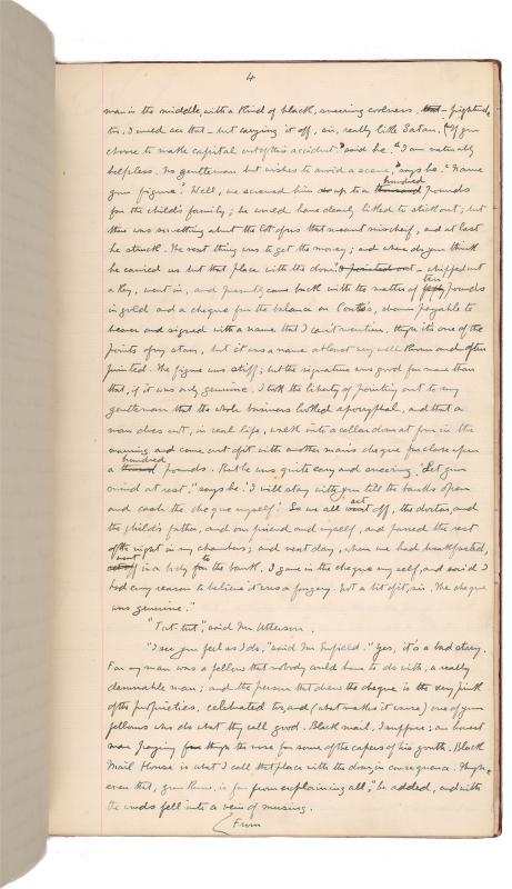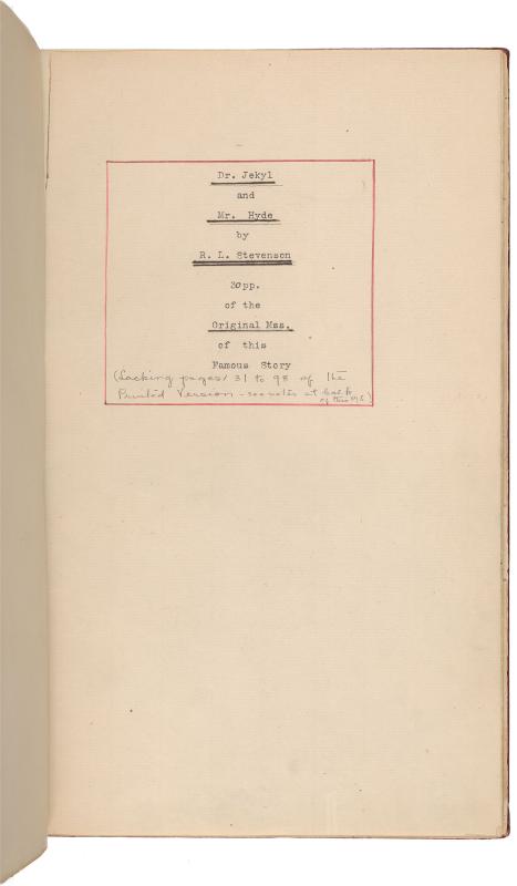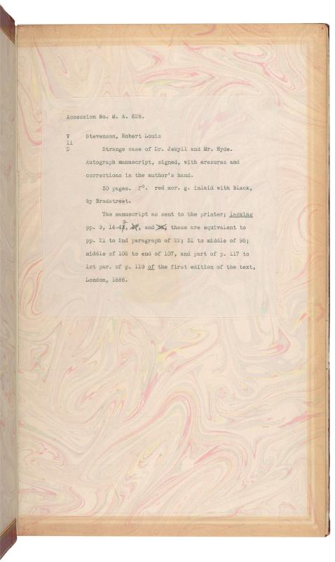The Morgan’s manuscript is not complete. The central chapters, covering the murder of Sir Danvers Carew and the denouement of Jekyll’s experiment, have not survived. After Stevenson’s death in 1894, the manuscript was owned by Isobel Strong, his stepdaughter; J. Pierpont Morgan bought it from her in 1909. Strong had given away several leaves, three of which made their way back to the Morgan Library in 1950s and ‘60s as the generous gifts of Edwin J. Beinecke. One other leaf is now at the Robert Louis Stevenson Museum in St. Helena, California. However, it seems likely that even when Strong owned it the central section was not extant.