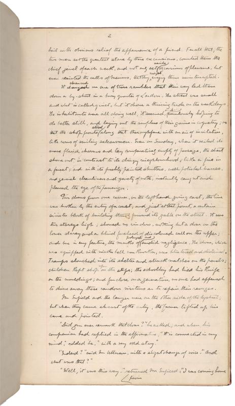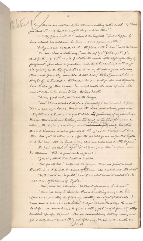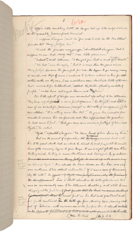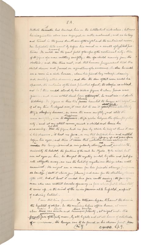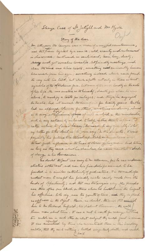 This manuscript of Robert Louis Stevenson’s novella The Strange Case of Dr. Jekyll and Mr. Hyde is the copy sent to the publisher Charles Longman in late October 1885, about six weeks after Stevenson first conceived of the idea. The Strange Case of Dr. Jekyll and Mr. Hyde is composed of a series of accounts and texts that slowly reveal the story of Dr. Henry Jekyll’s decision to create a separate body for himself, Edward Hyde, through which his baser instincts can be expressed, and the consequences of that decision. As in other tales of problematic births from Frankenstein to Jurassic Park, the monster, once out, begins to assert control over its creator.