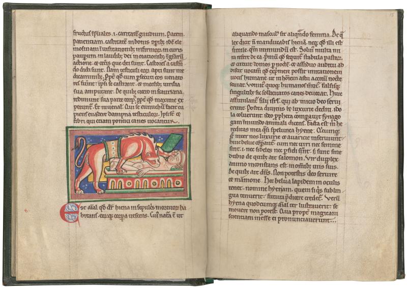 A hyena demonstrates why it was thought to be an unclean animal by feasting on a corpse; the anti-Jewish text associates it with “the children of Israel.”