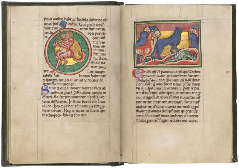 This Satyr—associated with the Greek god Dionysus by its pine-cone topped thyrsus—is classified in the bestiary as a type of ape.